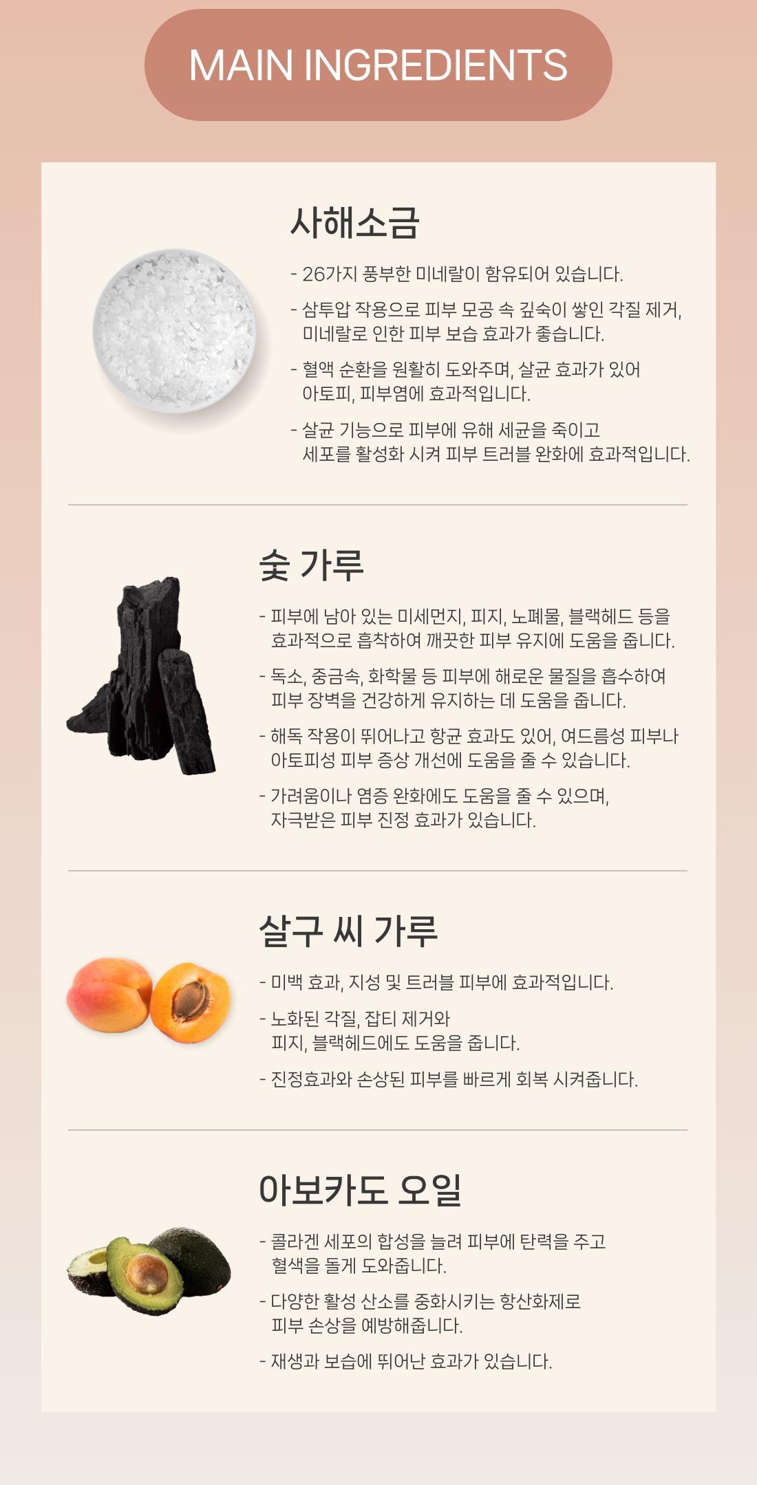 살구씨가루, 숯가루, 사해소금, 소듐클로라이드, 피이지-7 글리세릴코코에이트, 쌀겨오일, 마카다미아씨오일, 호호바씨오일, 해바라기씨오일, 매도우폼씨오일, 잇꽃씨오일, 아보카도오일, 아르간트리커넬오일, 숯가루, 토코페릴, 아세테이트,소듐하이알루로네이트, 하이드롤라이즈드하이알루로닉애씨드, 소듐아세틸레이티드하이알루로네이트, 1,2-헥산디올, 글리세린, 정제수, 말로우추출물, 페퍼민트잎추출물, 카무슬립추출물, 성모초추출물, 꼬리풀추출물, 레몬밤잎추출물, 서양톱풀추출물, 에탄올, 향료(복숭아향)