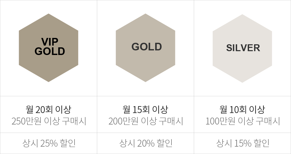 회원등급은 최근 6개월 구매실적을 기준으로 매월 1일 자동으로 산정됩니다.